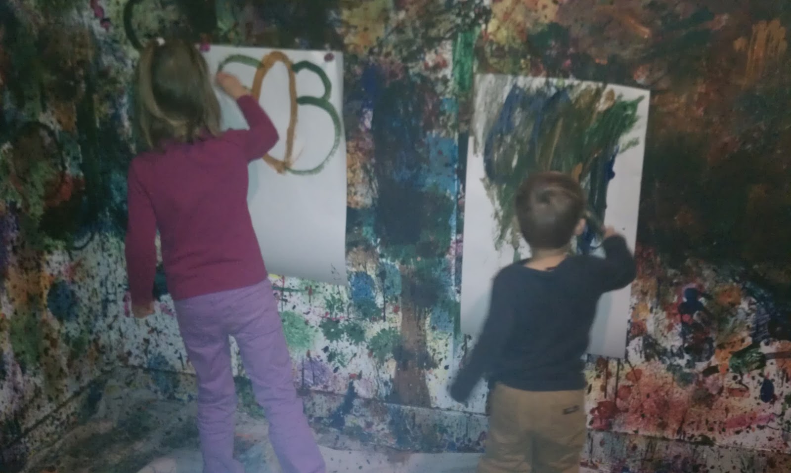 We used our final art coupon and both kids had a ball painting in their paint room. The photos are dark but one of the rooms in their studio is covered with paint. The kids could paint on paper or right on the walls. A great place to let their creative juices flow and not have to worry about clean up.